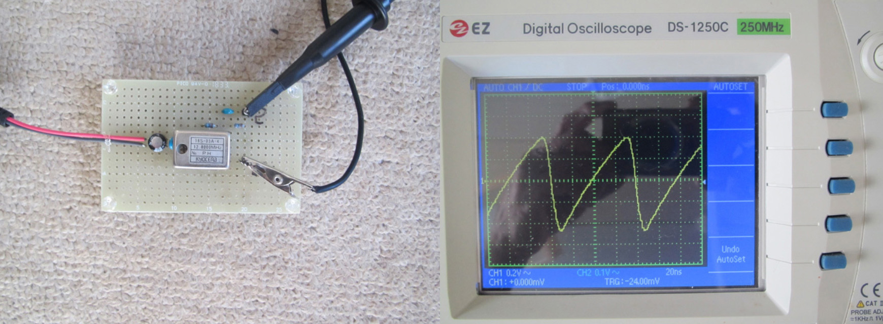 オシロの測定範囲が10MHzしか無いので水晶発信機等の周波数は測れません、というか波形が正弦波のような形になってしまいます。