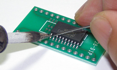 LM1972Mを置き、位置を確定したら前記の濡らした部分のピンに上からコテをあてて熱を加え軽く接着させます(前記の濡らした少量のハンダだけで接着)。