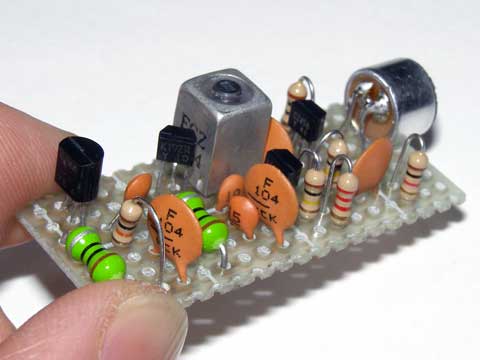 | ここまで作業が進むとパーツのリード線の切れ端が出てくるでしょう。 その切れ端を利用してECM(コンデンサマイク)にリード線として ハンダします。そして回路基板にECMをハンダします。 ECMの極性も注意です。間違えると音が入ってきません。 ![]() ![]() |